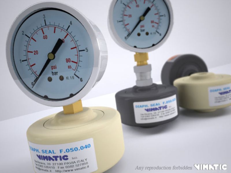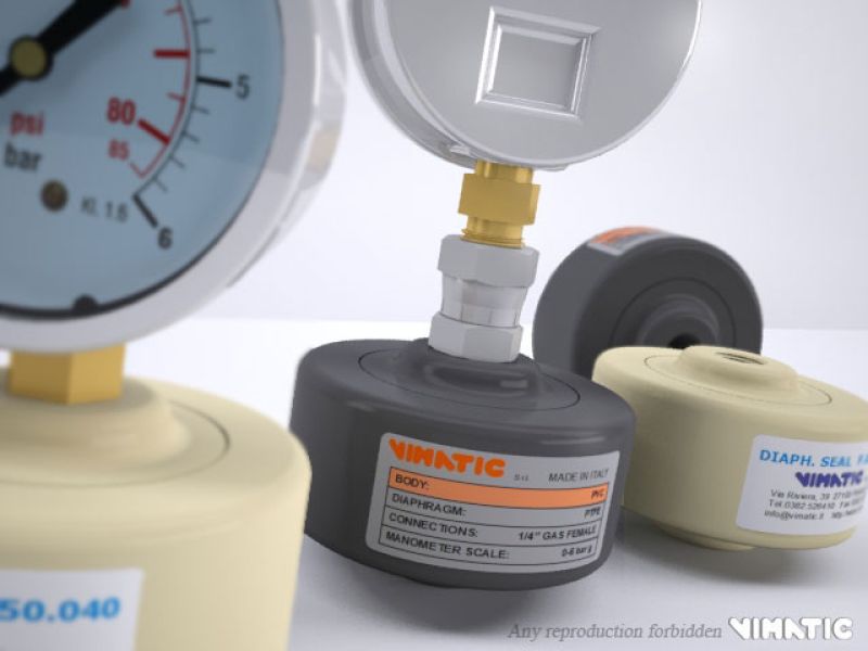 Vimatic liquid Separators have been developed for the measurement of pressure in case of transit of a corrosive liquid able to deteriorate and damage the manometer; they are made of two half-shell conveniently assembled and divided by a PTFE diaphragm. Since the cavity above the diaphragm is fulfilled with glycerin, the aggressive fluid pressure is transferred to the manometer without danger of direct contact. Unique characteristic of Vimatic's liquid separators is the total absence of metal elements (e.g. screws), this is an additional performance guarantee also with particularly aggressive liquids.