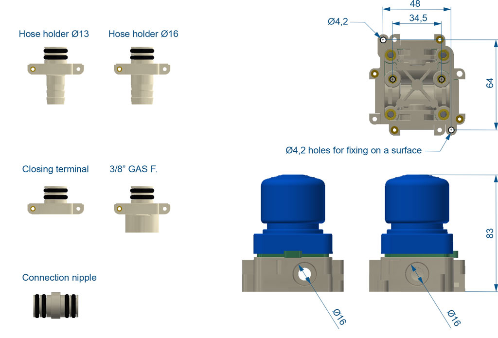 With the different connections, configurations can be adapted by modifying inlets, outlets, and flow directions. With this system, valve batteries can be assembled even in multiple rows without the need for gluing or welding.