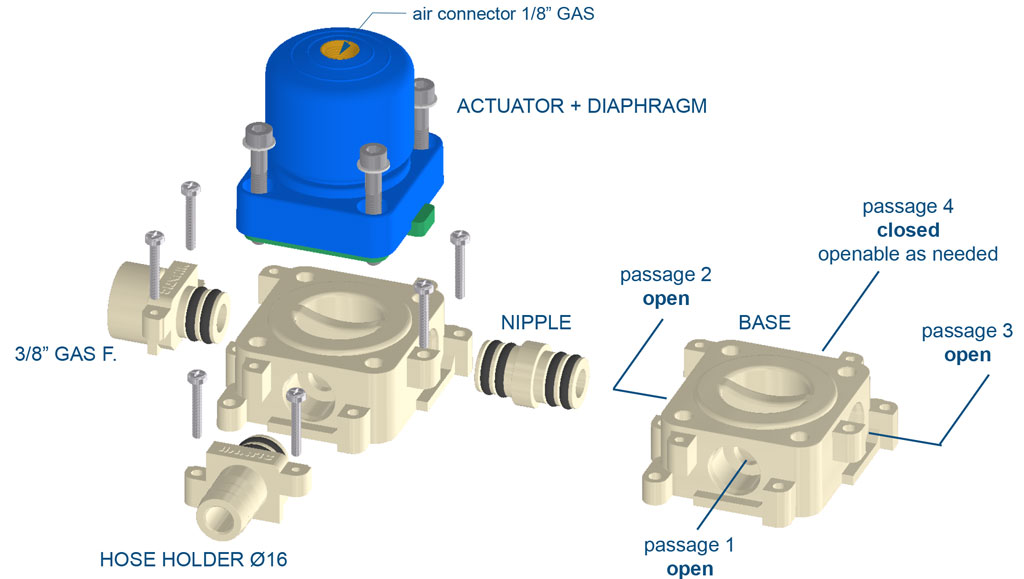 Each valve is supplied with three pre-opened passages, while a fourth passage can be opened by the end user according to specific requirements. These features, combined with the air connection located on the upper part of the actuator, make the manifold valves particularly suitable for compact multi-valve assemblies.