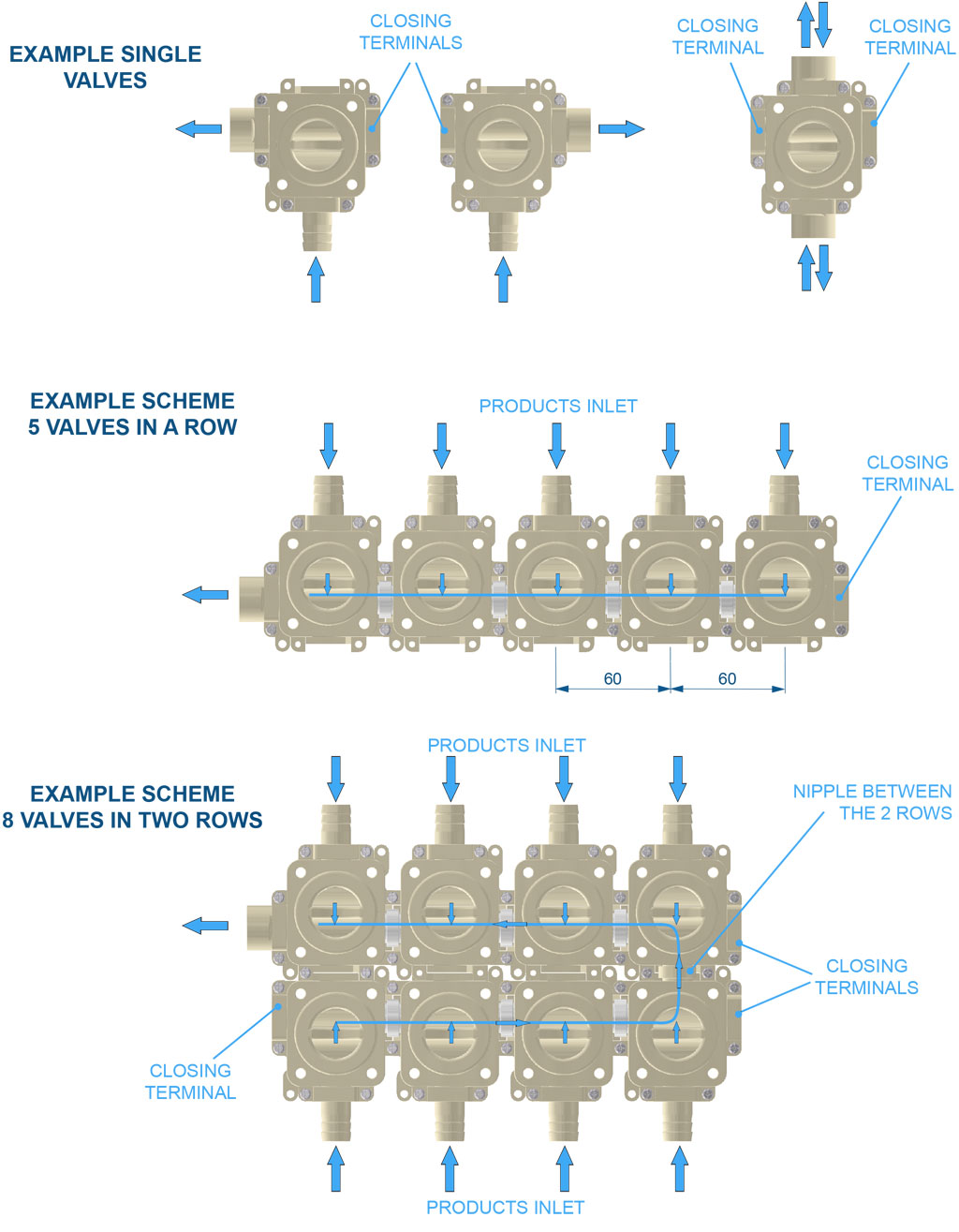 They represent a fully modular system for assembling valve groups to manage different products. The system is extremely versatile, allowing users to assemble the desired number of valves and easily carry out modifications and maintenance. The valves are connected to each other with special nipples.