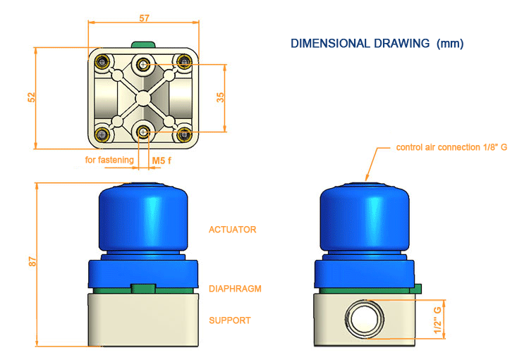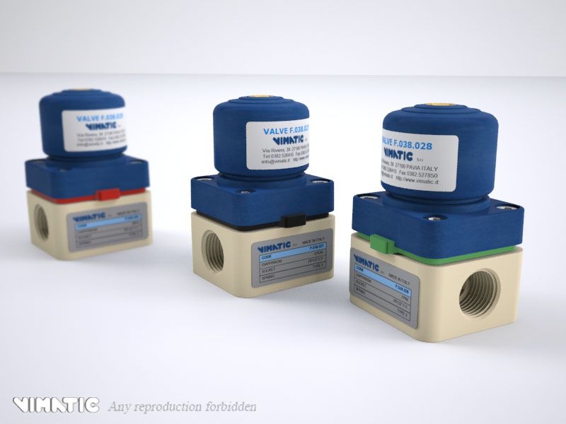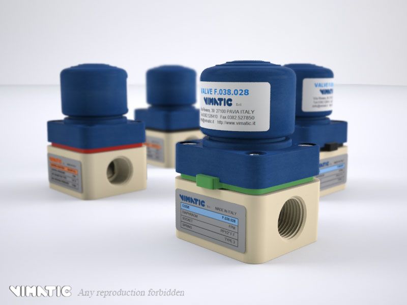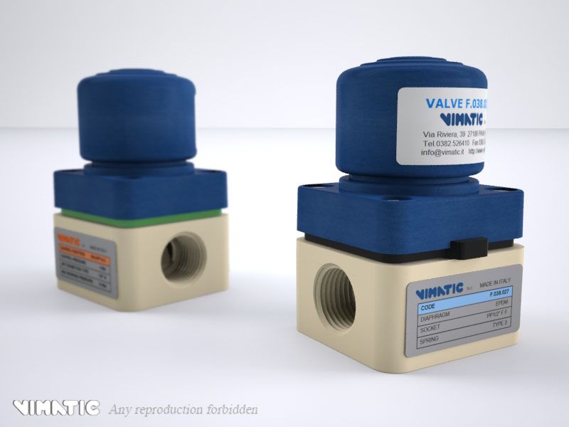 This new version of the Vimatic valve features a raised connection base to accommodate 1/2" female threaded connections. Like all Vimatic plastic pneumatic valves, these are particularly useful to measure liquid and erosive substances; ease of use and unique characteristics such as the air control on the top make them suitable for the line assembly so to minimize the overall dimensions. All the materials used for the construction are of high quality. The bases and the internal diaphragms can be differentiated according to the liquid to be detected, which guarantees long time reliability. Every valve is checked and duly tested in every phase of the production so to ensure the absolute integrity.