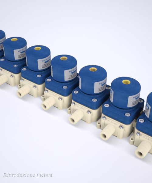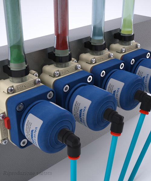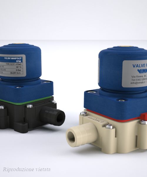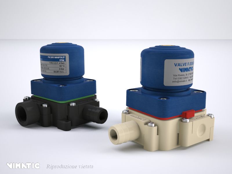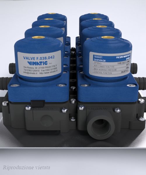 Le nuove valvole a “manifold” in materiale plastico della Vimatic sono un’evoluzione delle precedenti “multivia”. Rappresentano un sistema totalmente modulabile per realizzare gruppi di valvole nella gestione di prodotti diversificati. Il sistema è estremamente versatile e consente di assemblare le valvole nel numero desiderato ed effettuare facilmente modifiche e manutenzioni. Le valvole sono collegate tra di loro con appositi nippli. Con i diversi attacchi, si possono variare le configurazioni modificando anche ingressi, uscite e direzione dei fluidi. Con questo sistema si possono assemblare batterie di valvole anche su più file senza la necessità di incollaggi e saldature. Queste valvole presentano 3 passaggi già aperti, mentre un quarto passaggio può essere aperto, secondo le esigenze, anche dall’utente finale. Queste caratteristiche, unite all'attacco aria posto sulla parte superiore dell’attuatore, rendono le valvole a “manifold” idonee all'assemblaggio in batteria con minimi ingombri. In relazione ai fluidi da intercettare, le membrane interne sono disponibili in EPDM, EPDM+PTFE, FPM, MVQ. Le basi con i relativi attacchi sono realizzati in Polipropilene (PP) o in Policloruro di vinile (PVC). I nippli e gli attacchi sono dotati di doppia guarnizione o’ring e sono fissati con viti in acciaio inossidabile. Le batterie di valvole possono essere fissate con viti su piastre / pannelli sia anteriormente che posteriormente.