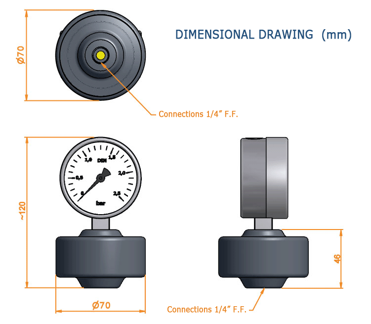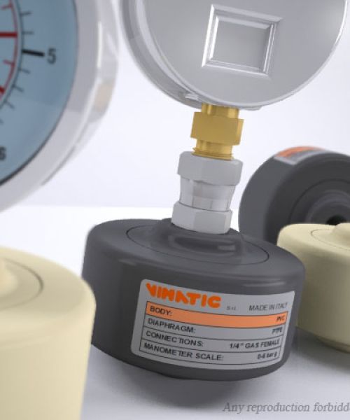 Vimatic liquid Separators have been developed for the measurement of pressure in case of transit of a corrosive liquid able to deteriorate and damage the manometer; they are made of two half-shell conveniently assembled and divided by a PTFE diaphragm. Since the cavity above the diaphragm is fulfilled with glycerin, the aggressive fluid pressure is transferred to the manometer without danger of direct contact. Unique characteristic of Vimatic's liquid separators is the total absence of metal elements (e.g. screws), this is an additional performance guarantee also with particularly aggressive liquids.