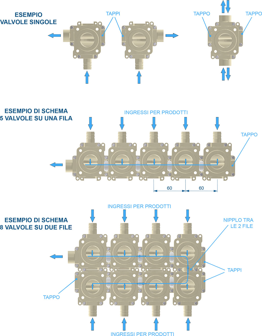Le valvole MANIFOLD possono essere fornite dalla Vimatic singolarmente con inclusi 2 attacchi mobili (portagomma, raccordo 3/8”, nipplo, tappo) o direttamente assemblate in gruppi di composizione e quantità variabile su richiesta del cliente. Queste sono alcune delle innumerevoli possibilità di installazione: