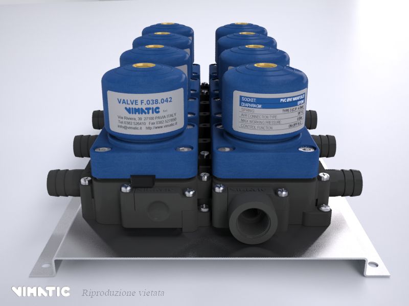 Le nuove valvole a “manifold” in materiale plastico della Vimatic sono un’evoluzione delle precedenti “multivia”. Rappresentano un sistema totalmente modulabile per realizzare gruppi di valvole nella gestione di prodotti diversificati. Il sistema è estremamente versatile e consente di assemblare le valvole nel numero desiderato ed effettuare facilmente modifiche e manutenzioni. Le valvole sono collegate tra di loro con appositi nippli. Con i diversi attacchi, si possono variare le configurazioni modificando anche ingressi, uscite e direzione dei fluidi. Con questo sistema si possono assemblare batterie di valvole anche su più file senza la necessità di incollaggi e saldature. Queste valvole presentano 3 passaggi già aperti, mentre un quarto passaggio può essere aperto, secondo le esigenze, anche dall’utente finale. Queste caratteristiche, unite all'attacco aria posto sulla parte superiore dell’attuatore, rendono le valvole a “manifold” idonee all'assemblaggio in batteria con minimi ingombri. In relazione ai fluidi da intercettare, le membrane interne sono disponibili in EPDM, EPDM+PTFE, FPM, MVQ. Le basi con i relativi attacchi sono realizzati in Polipropilene (PP) o in Policloruro di vinile (PVC). I nippli e gli attacchi sono dotati di doppia guarnizione o’ring e sono fissati con viti in acciaio inossidabile. Le batterie di valvole possono essere fissate con viti su piastre / pannelli sia anteriormente che posteriormente.