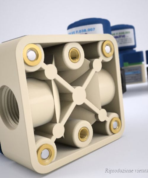 - Cod. F.038.003 Valvola con base in Polipropilene (PP) - Attacchi 3/8"G. F.F - Molla attuatore Tipo 3 - Membrana in FPM